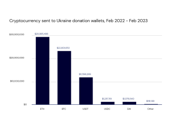 Od začátku války získala Ukrajina formou darů prostřednictvím kryptoměn téměř 70 milionů dolarů. Nejčastěji jde o Ether (téměř 29 milionů dolarů), Bitcoin (téměř 23 milionů dolarů) a Tether (11,6 milionů dolarů). Uvedla to společnost Chainalysis.