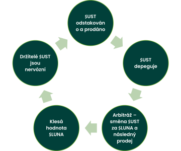 V bearmarketu se ale děje přesný opak. UST je prodáváno kvůli strachu a nejistému krytí UST. Cena UST depeguje (pozn.: odchylování měny od stabilního kurzu) a toho využívají arbitražéři k výhodné směně $UST za $LUNU, kterou ale ihned opět směňují za jinou kryptoměnu. A tak cena $LUNA stále klesá, což vede k větší panice u držitelů $UST a opětovnému prodeji.